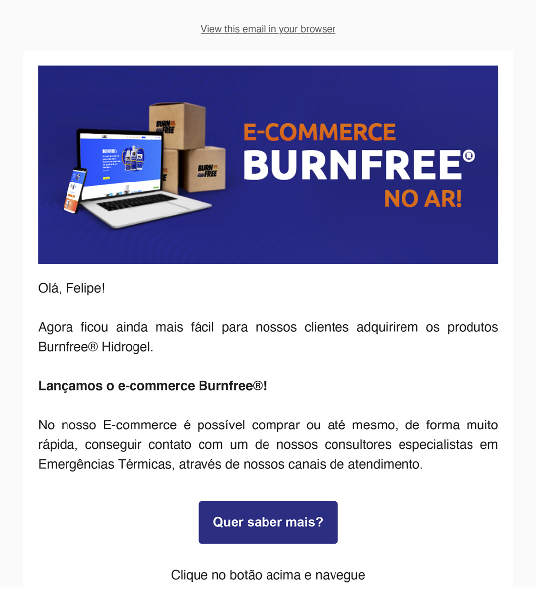 Apesar de sua popularidade no exterior, a distribuição do BurnFree® só foi aprovada no território brasileiro em 2021. Após o lançamento do seu E-commerce, participei da sua Campanha de divulgação e prospecção através de Mídias e E-mails Marketing.